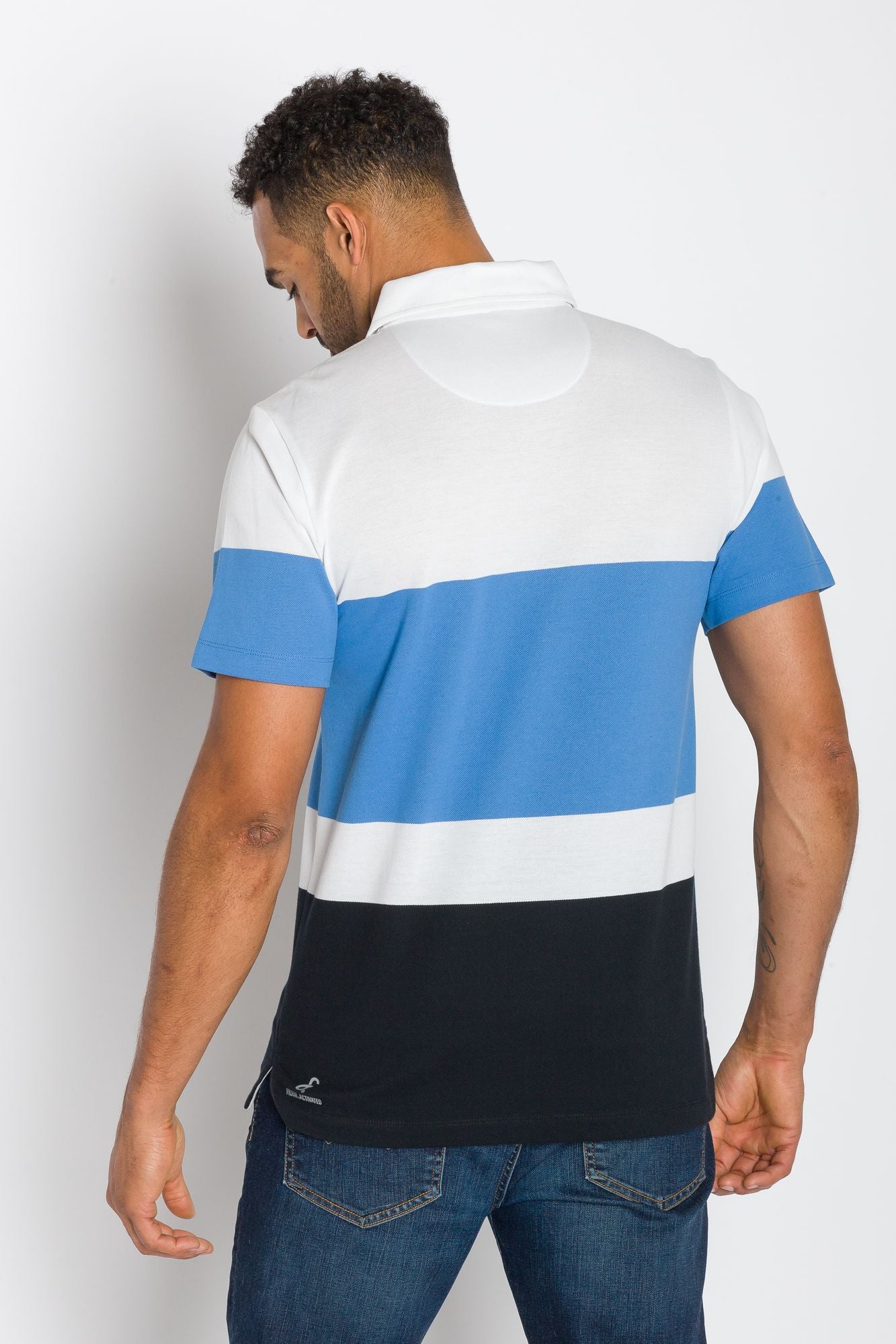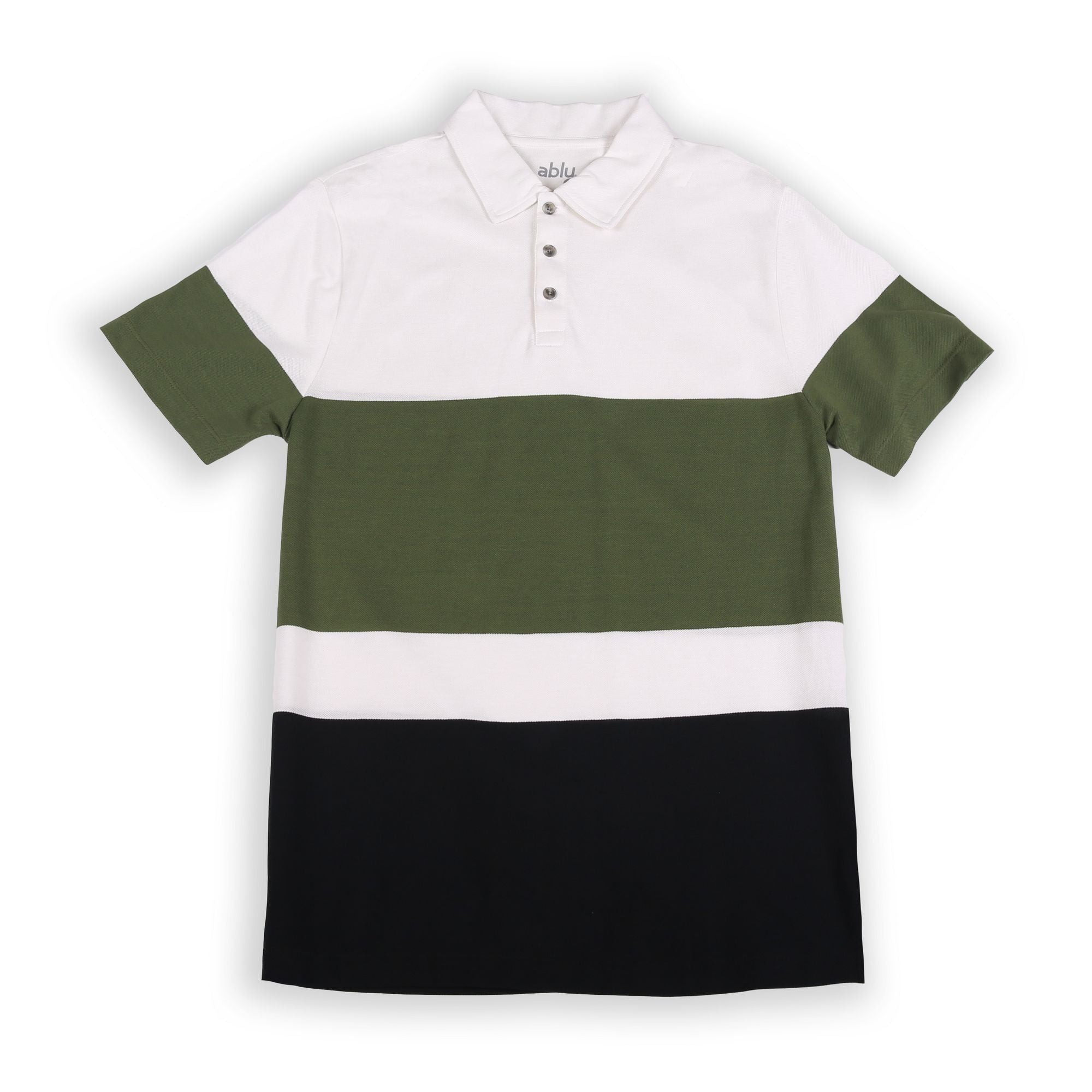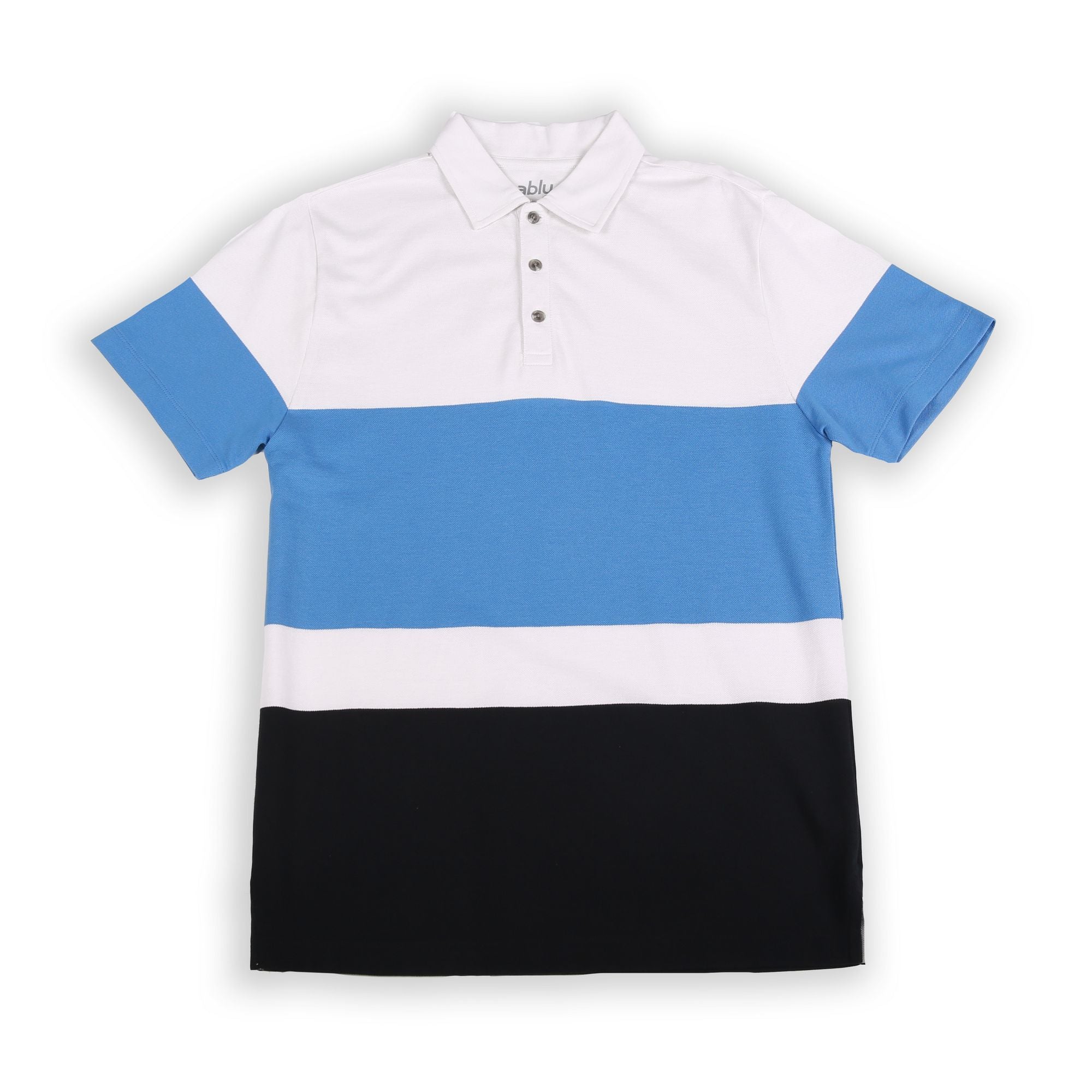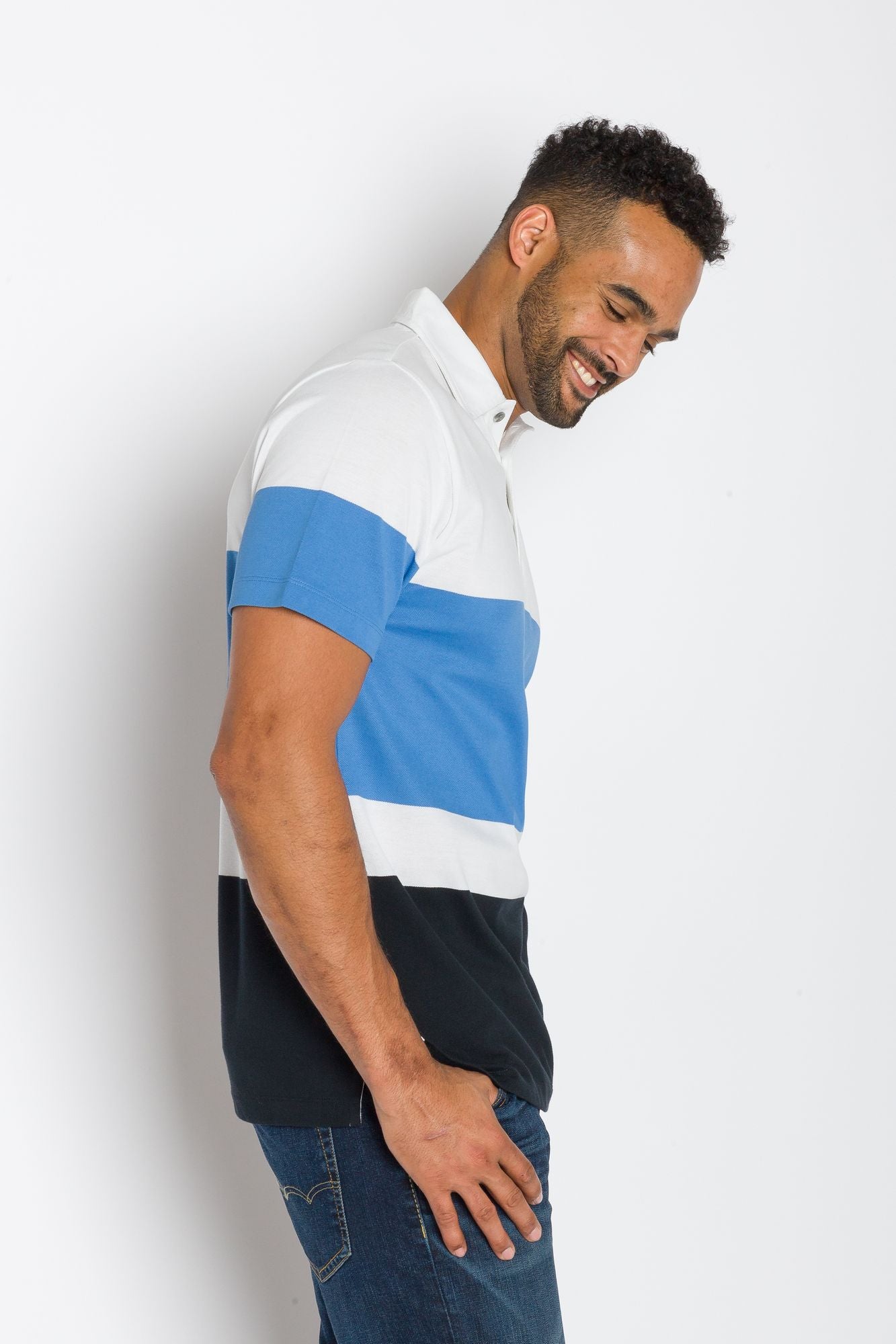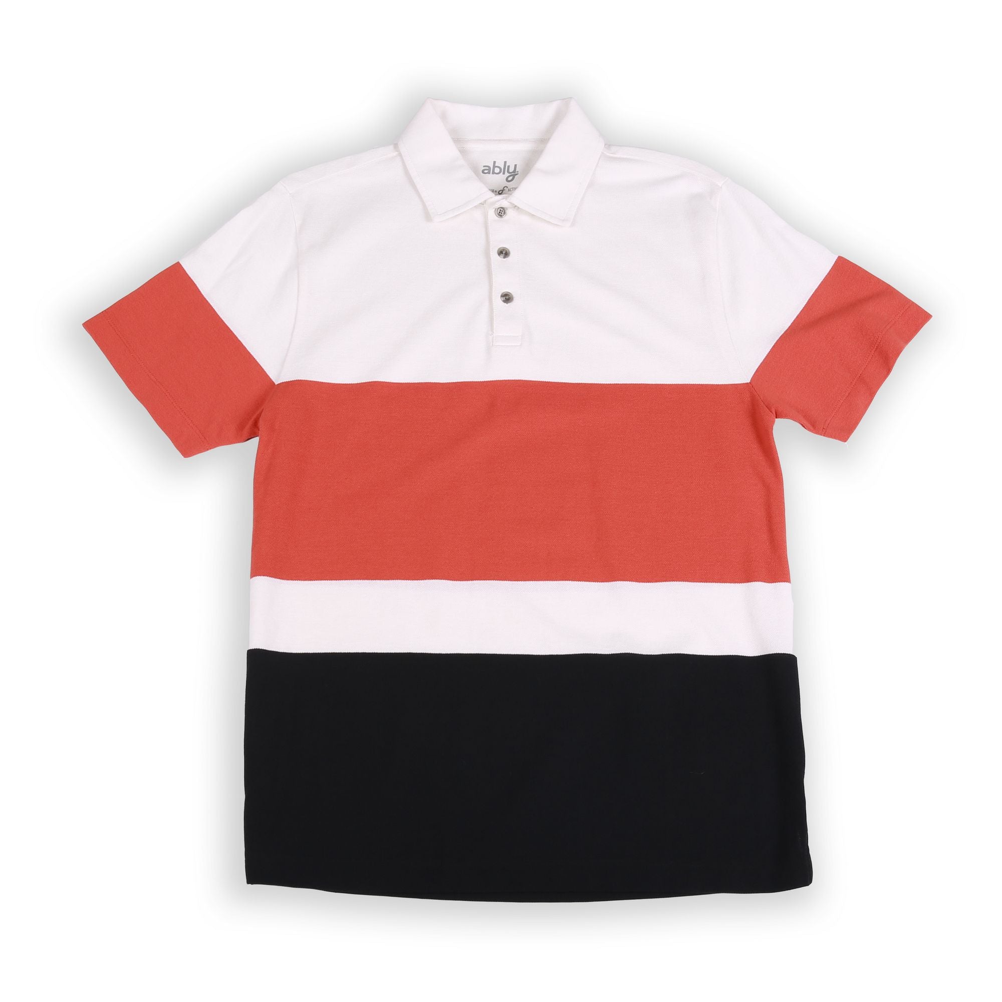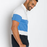 A modern twist on a classic striped polo. Our engineered stripe plays on color blocking with sophistication. Easy to dress up or dress down. Details include a flat rib collar, side vents and reinforced front button placket.
