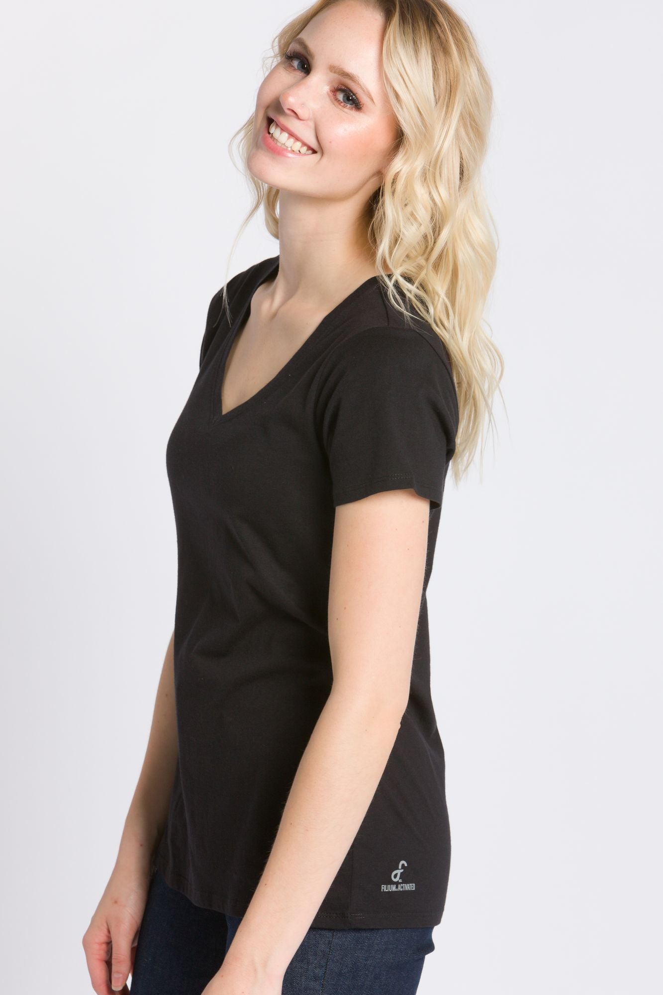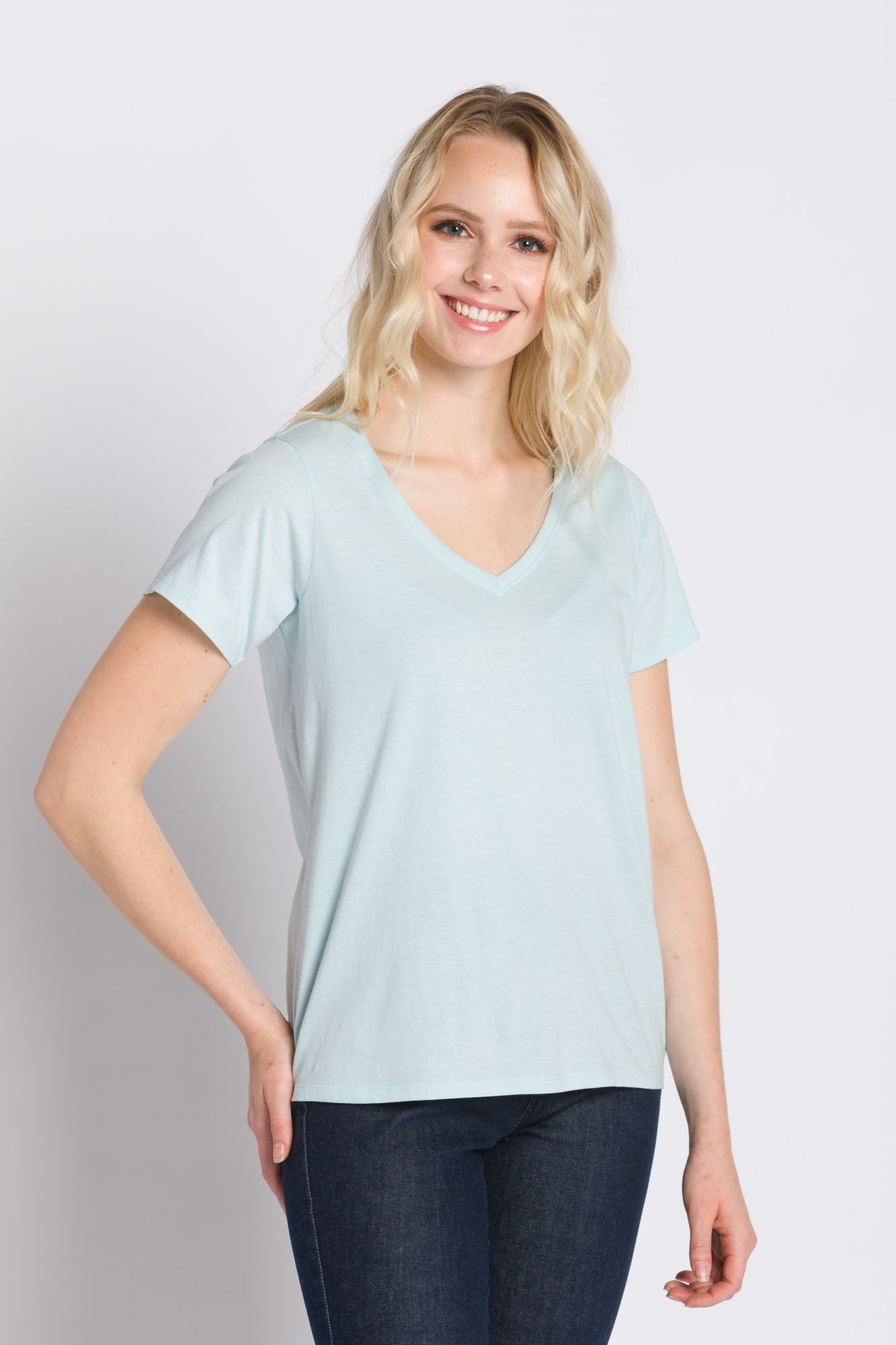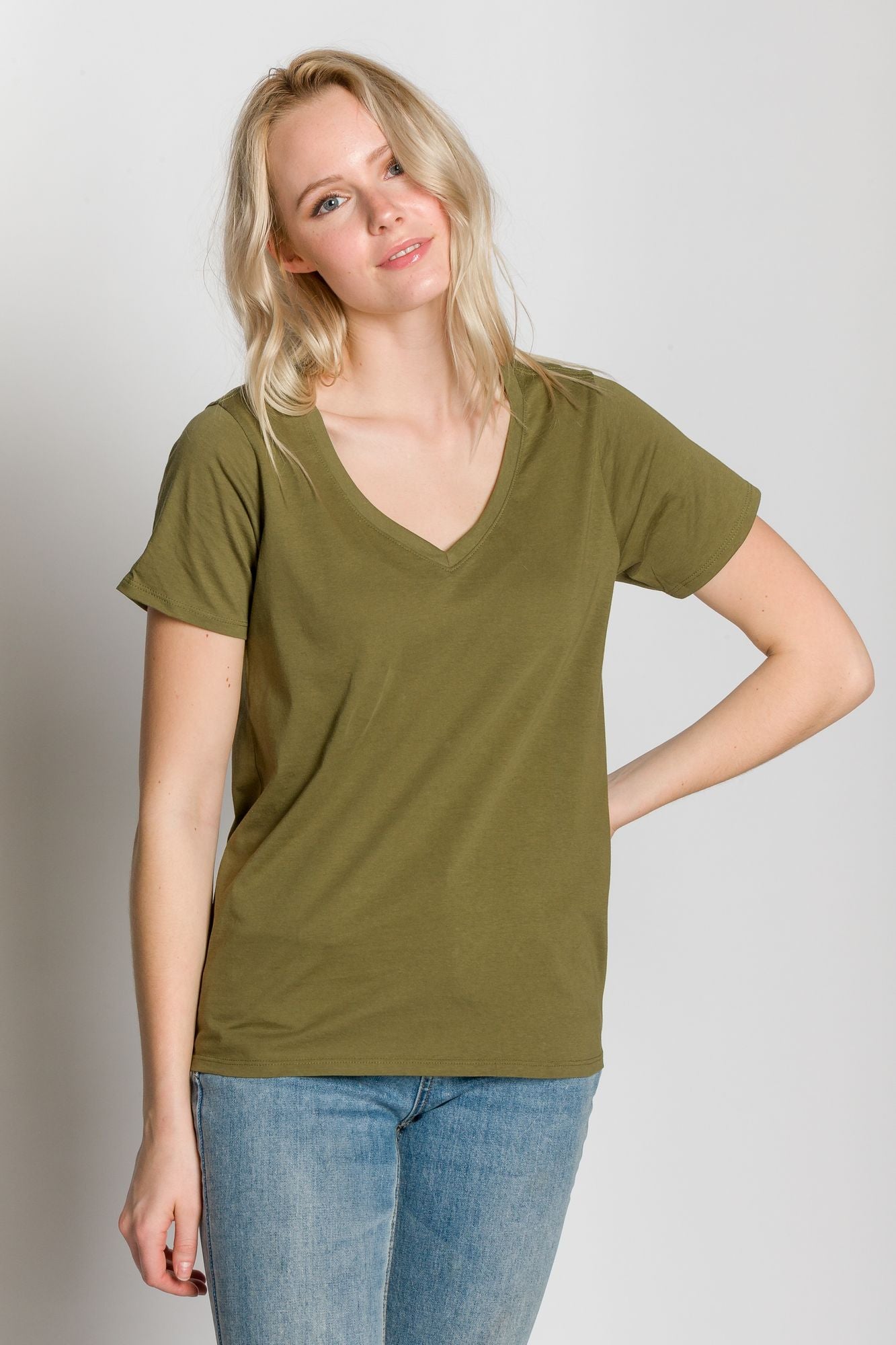 Deep V-neck with a subtly rounded collar, straight hem, and simple relaxed cut for a flattering silhouette.