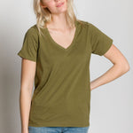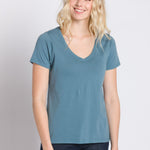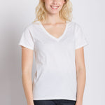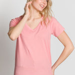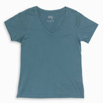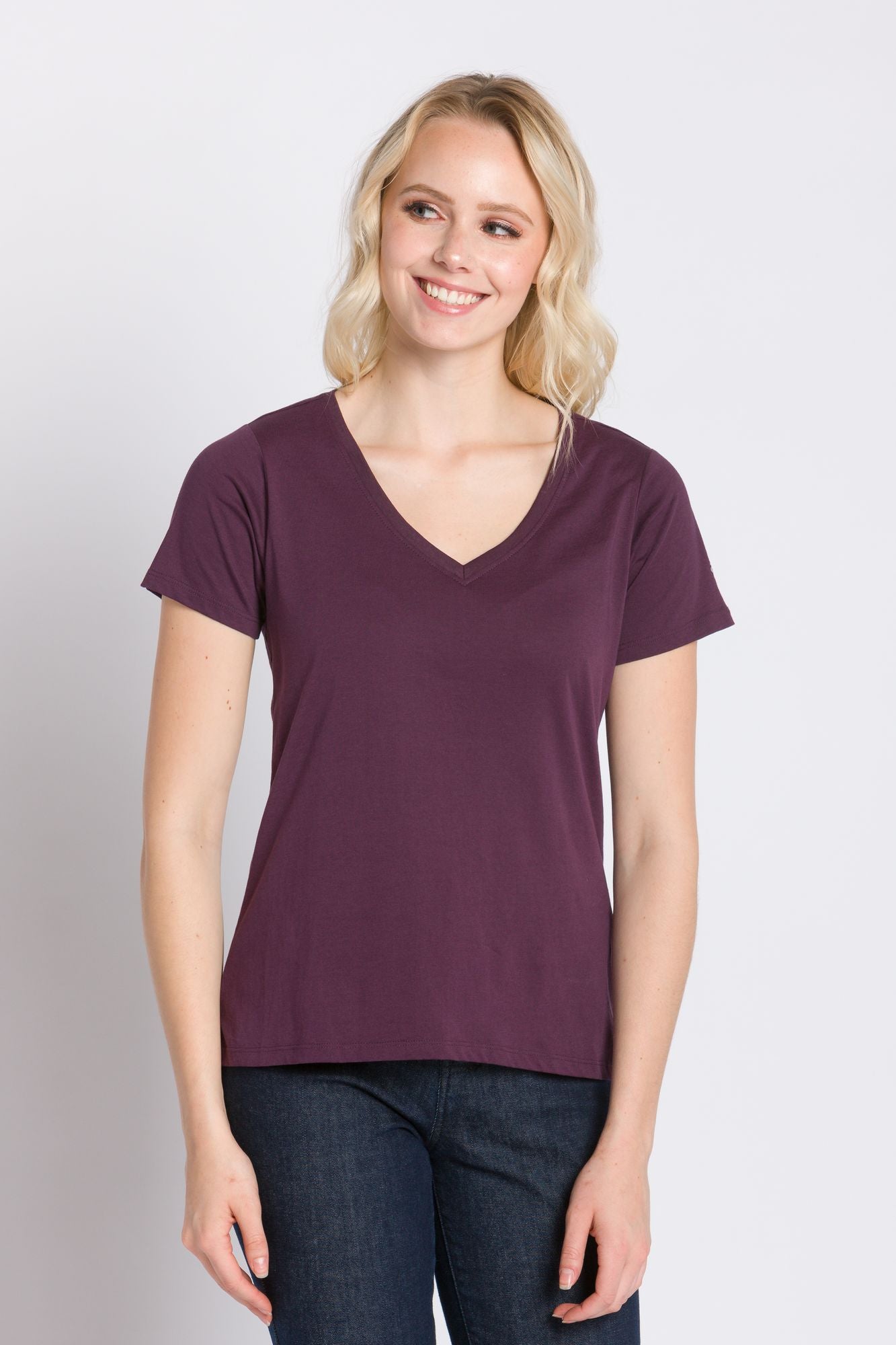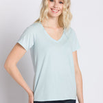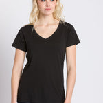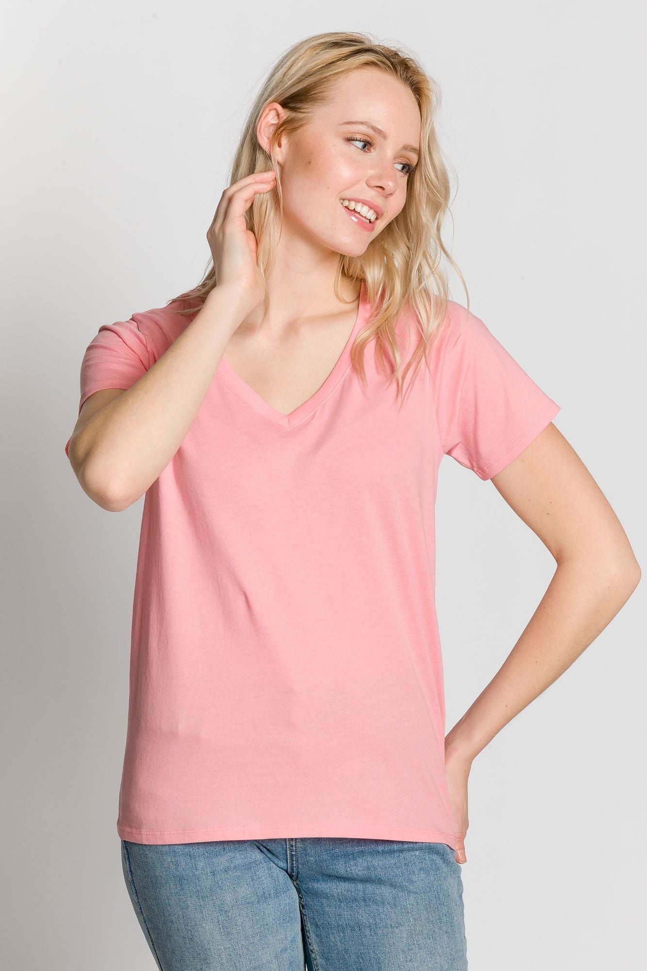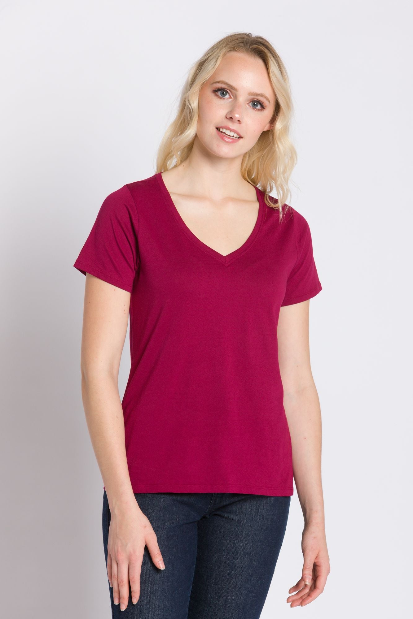 Deep V-neck with a subtly rounded collar, straight hem, and simple relaxed cut for a flattering silhouette.