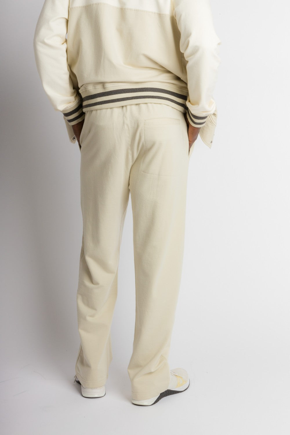 James is the non sweatpant pant.   He has the feel of your favorite knit sweat but with some trouser elements.  Two on seam front pockets and one back pocket.  Drawstring waistband.   A 220 gram weight allows it to be worn throughout the year.