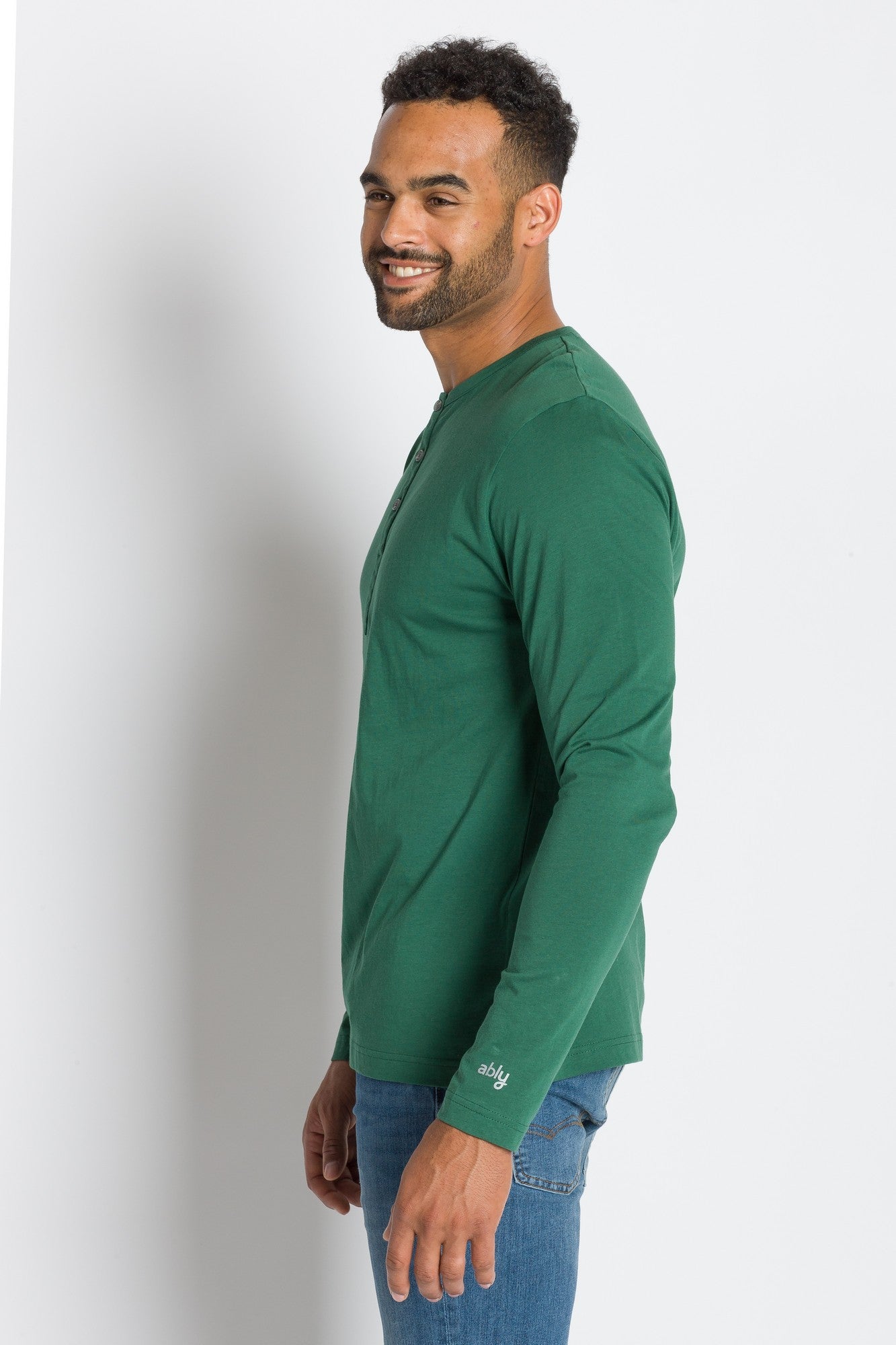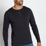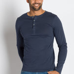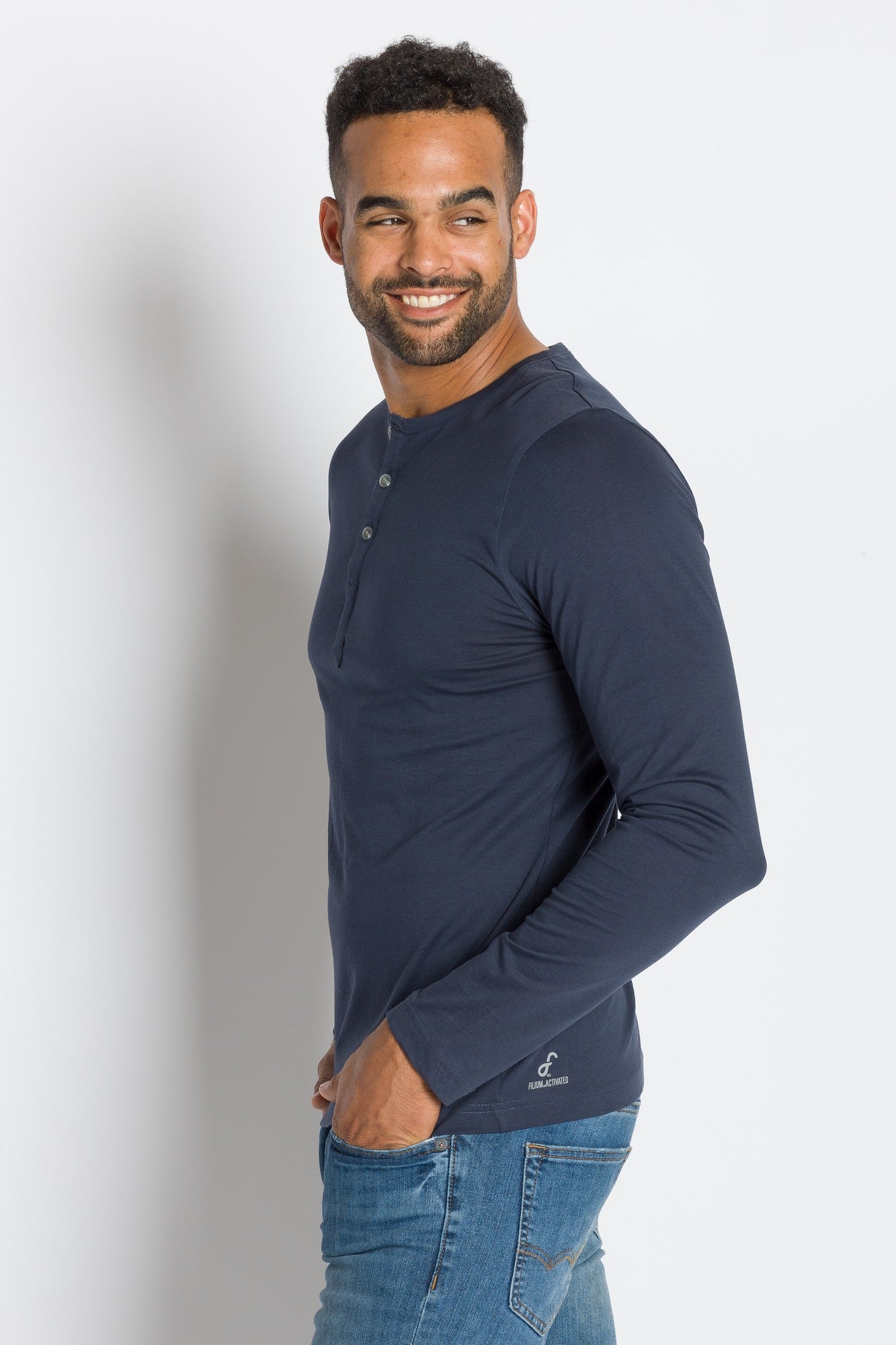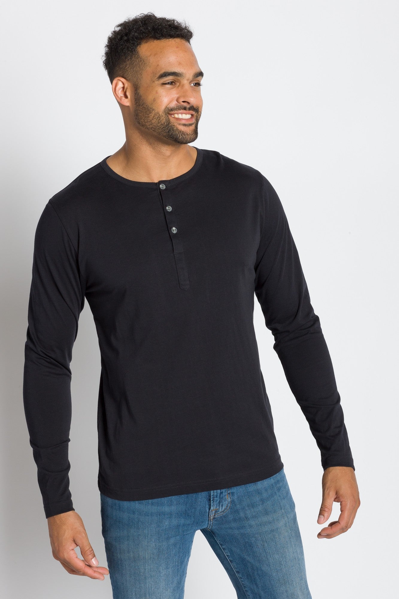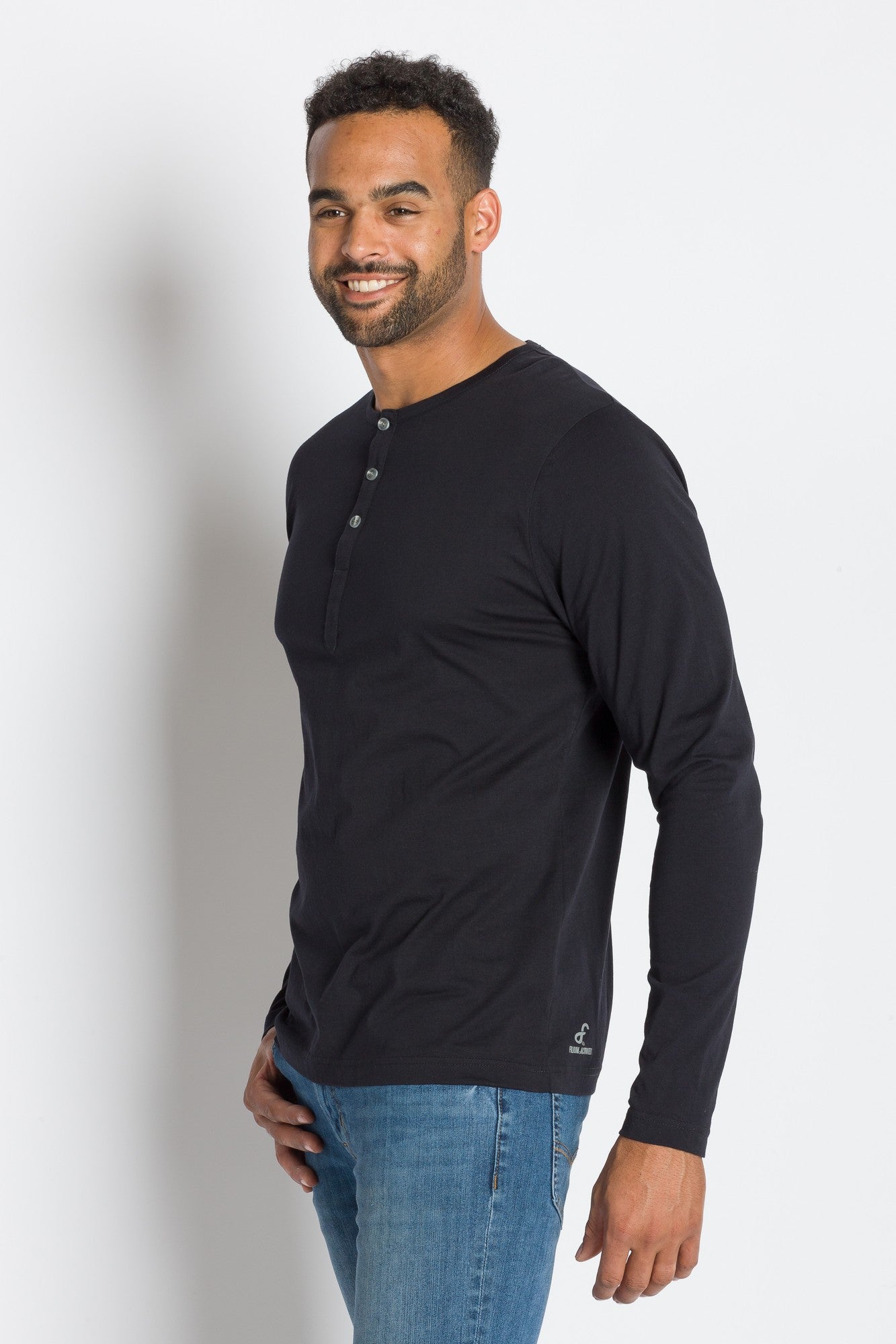 Long-sleeved crew neck henley with three button placket. Straight hem and tailored for clean lines and a slim fit. Made with 100% premium cotton for a lightweight, breathable shirt you can wear all day out on a hike and the next day out on a date.