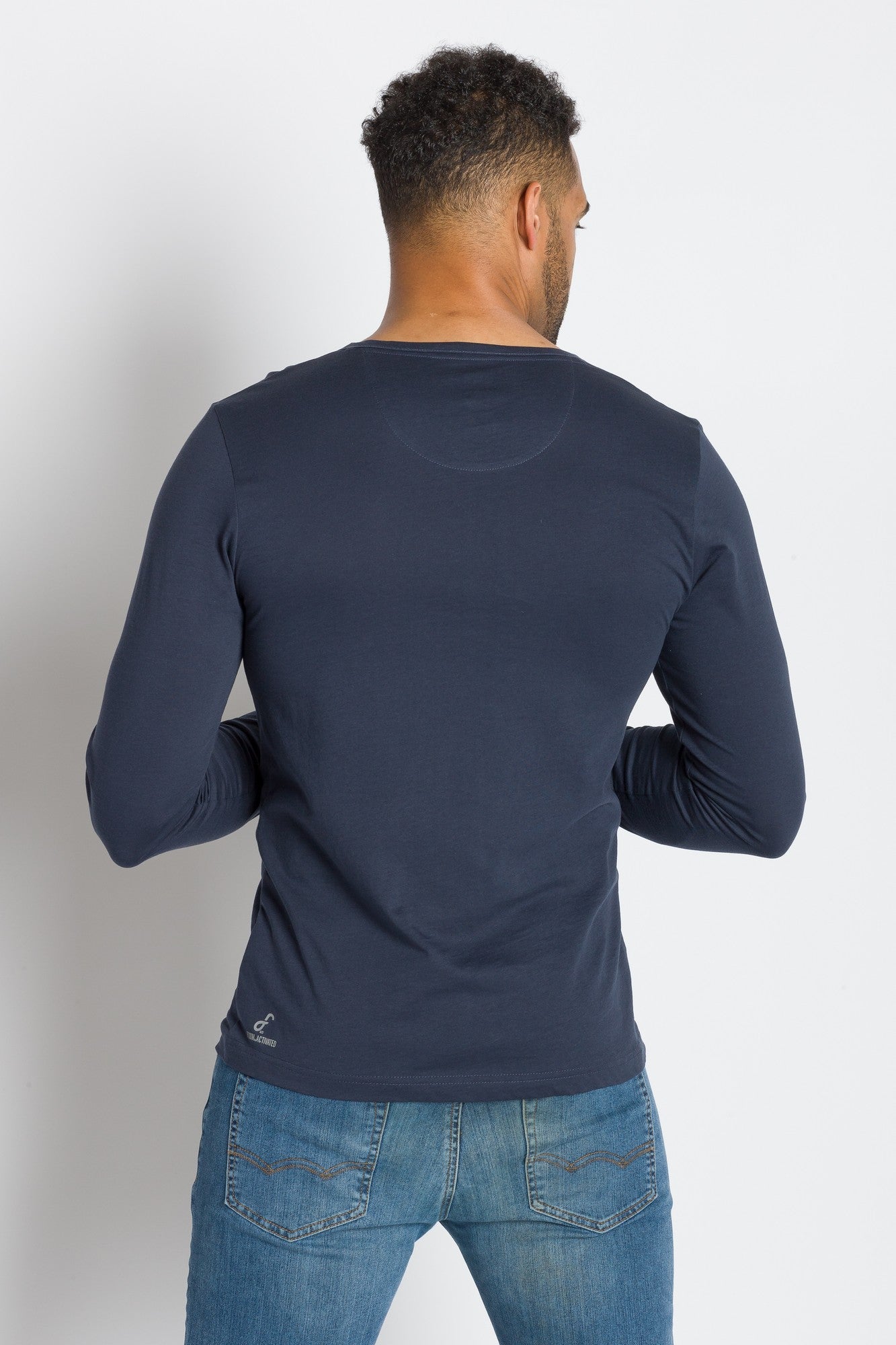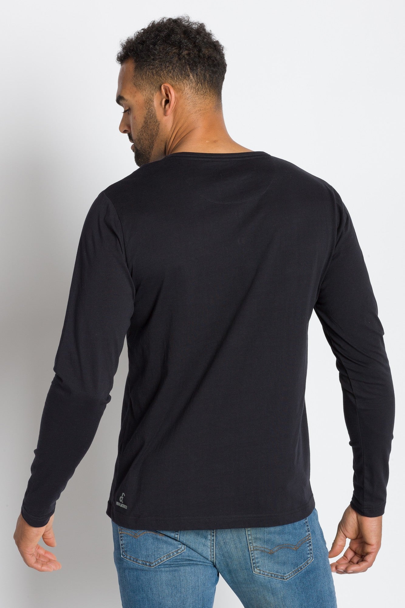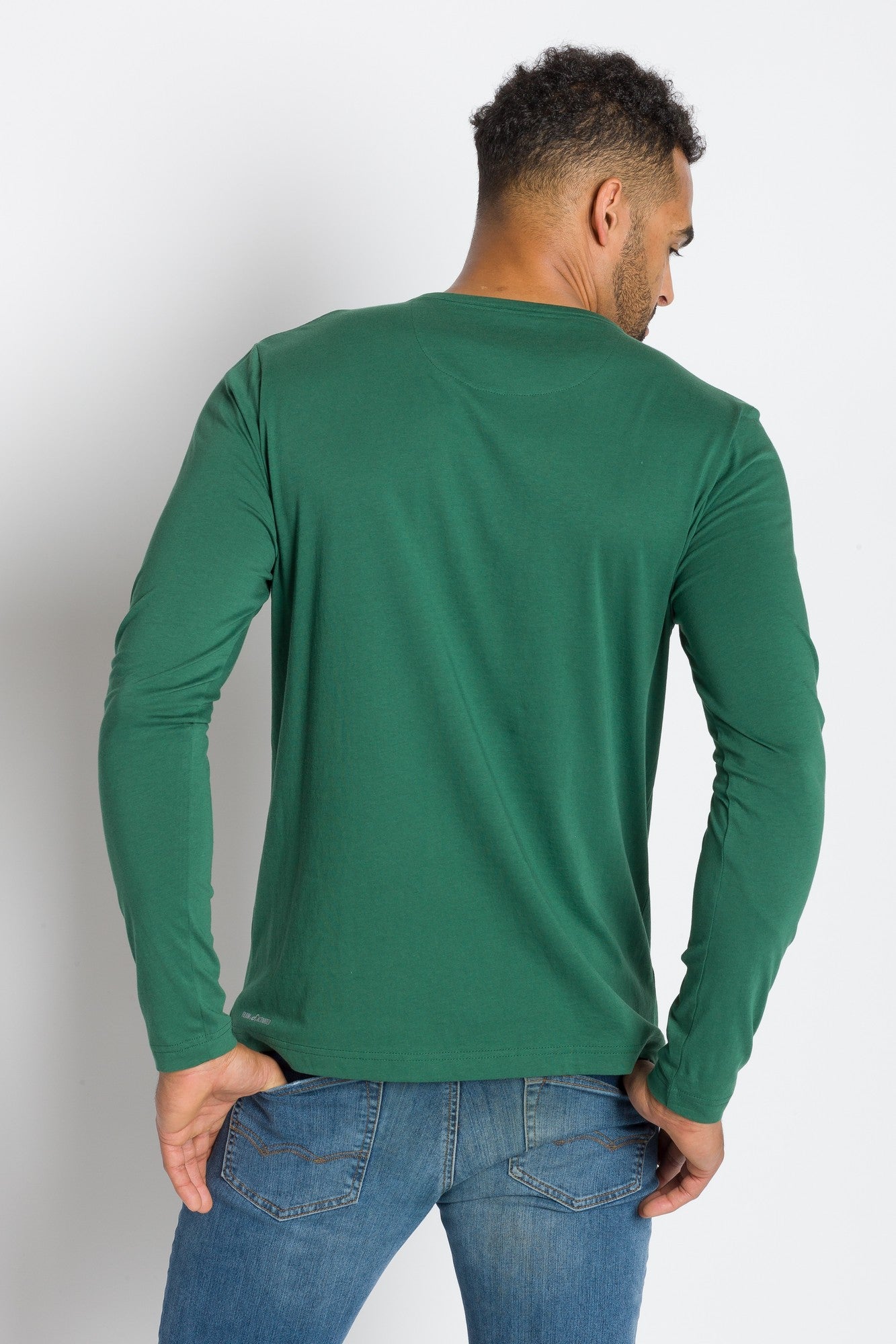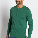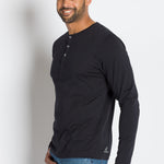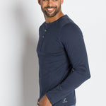 Long-sleeved crew neck henley with three button placket. Straight hem and tailored for clean lines and a slim fit. Made with 100% premium cotton for a lightweight, breathable shirt you can wear all day out on a hike and the next day out on a date.